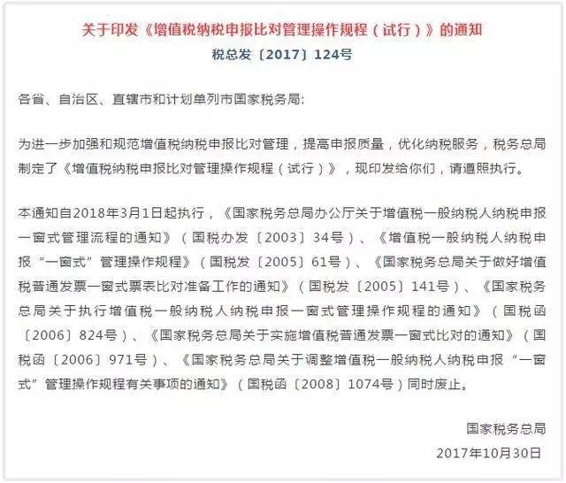 为了进一步加强和规范增值税纳税申报比对管理,提高申报质量,优化纳税服务,税务总局就制定了《增值税纳税申报比对管理操作规程(试行)》,以下简称”规程“,将于2018年3月1日起在各省市国税局开始施行。