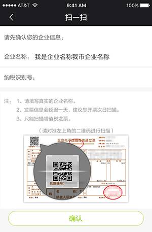 如果您是第一次使用扫一扫录发票功能,在进入扫描二维码页面前,会进入企业信息确认页面,在该页面填入真实的企业名称和纳税识别号,点击“确认”按钮,我们会记录您的企业信息,在后续以此识别您扫描的发票是进项还是销项发票,您只需录入一次哦。