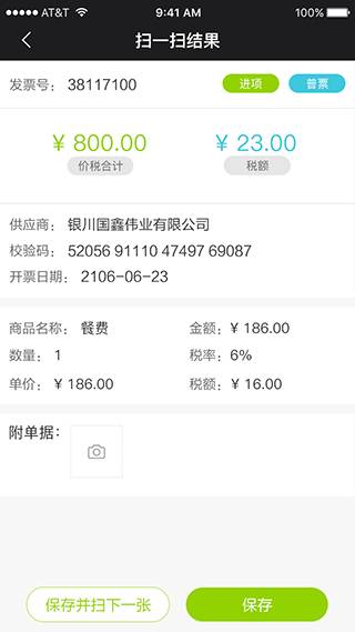扫描成功,发票的详细信息都能一次获取,还能自动判断进项或者销项。点击附单据旁的相机图标,拍照上传发票原始照片,点击“保存”按钮,这张发票录入成功,您在电脑上登录好会计同样能够查询到这张发票信息,发票录入从此变得无比简单。
