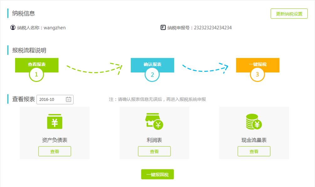 填写企业信息,完成纳税识别号的绑定后,进入报税页面。首次登录,默认进入设置页面。