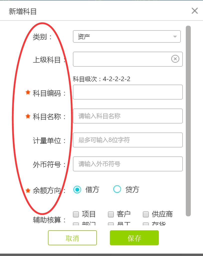三:根据公司行业情况逐步填写新增科目信息,标注红星项目为必填项,点击保存生成新增科目