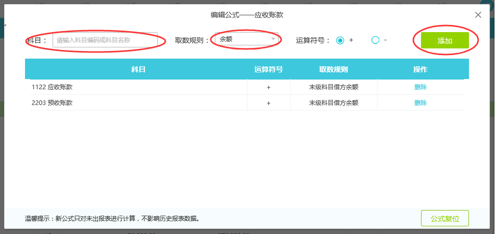 三:选择科目、取数规则、运算符号,点击“添加”,如上图。