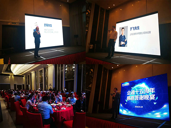 企通十五周年感恩答谢晚宴,200多位企通客户欢聚一堂,用友网络助力总裁舒展总和上海企通软件总经理于飞总分别为客户答谢晚宴做感恩致辞。