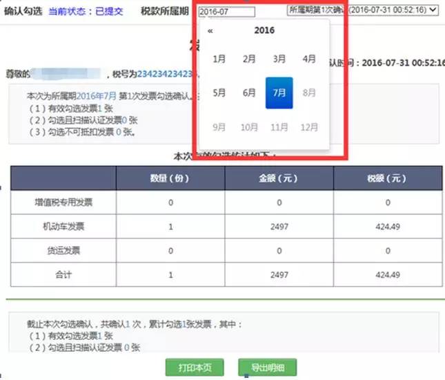 1. 关注界面上的当前税款所属期,您勾选的发票,将属于当前的所属期;(例发票税款所属期是6月开具,进行发票勾选并确认勾选后,您的本张发票信息将体现在6月份所属期统计结果内)