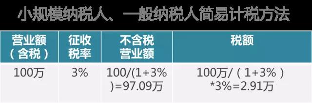 营改增后,你月营业额是100万,按照简易计税方法,餐饮业征收率是3%,注意这里你不能直接拿营业额100万乘以3%,而要先将100万换算成不含税的营业额,计算方式就是100万除以(1+3%),再用不含税的营业额,乘以征收率3%,这样算出我当期要交的增值税税额为2.91万。