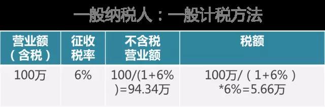 其实和刚才的简易计税方法类似,首先将你的营业额换算成不含税的,然后用不含税的营业额乘以税率。营改增之后你成为一般纳税人,税率变为6%,先做换算不含税的营业额,100万/(1+6%),得出94.34万,再乘以一般纳税人的税率6%,算出销项税额是5.66万。