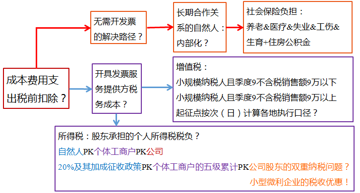 但把这些为企业长期提供了某项服务的自然人内化到企业内部作为员工管理并发放工资,是达到了费用支出税前扣除的目的,但从税负方面来说工资实行九级累进,税负如何要看月工资及年度奖金情况。但内部化有件很麻烦的事儿会如影随形,那就是社保,它会将用人成本提升40%以上,所以当我与一个咨询者交流时这个方案直接被否啦。