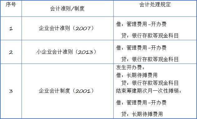 由以上表格看出,大、小会计准则对于筹建期开办费的财务处理规定相同,而会计制度则要求费用发生时先归集到长期待摊费用,待筹建期结束后,自生产经营当月起一次性计入“管理费用”科目,进入开始生产经营当月的损益。