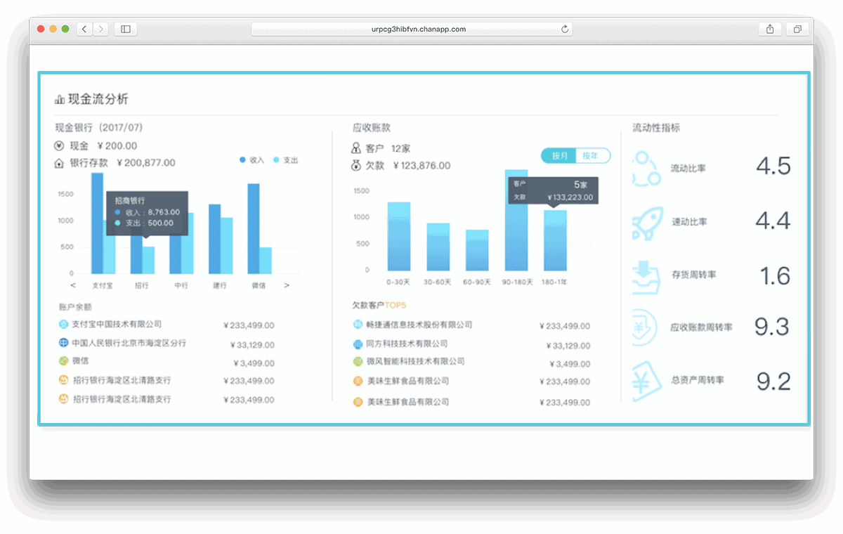 智能财务决策,为老板提供四大管理报表,图表化财务管理分析,现金流分析、经营状况分析,移动端可随时分享报表,让老板实时了解相关财务信息