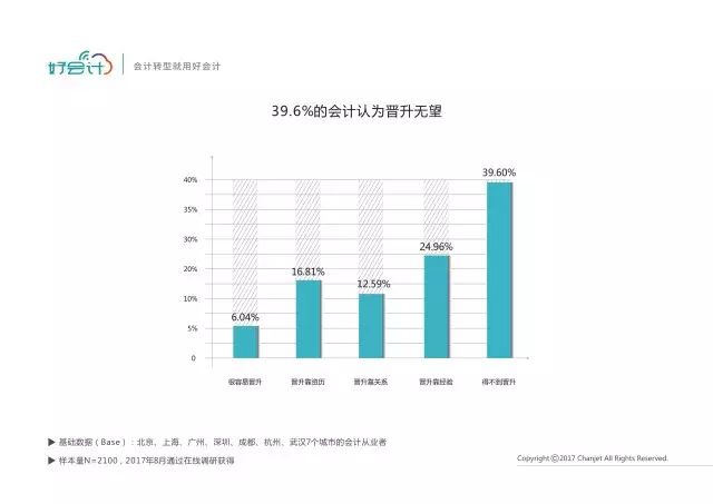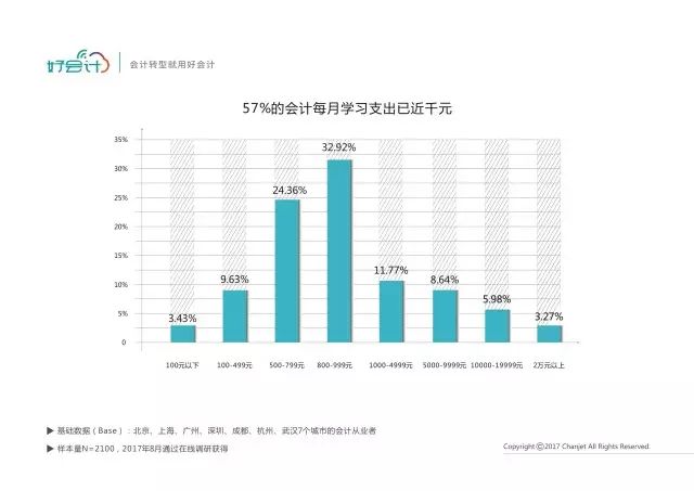 畅捷通作为中国领先的小微企业财务及管理服务提供商在2017年8月对来自北京、上海、广州、深圳、成都、杭州、武汉7个城市的会计从业者发起了一项在线调研,参与调研者年龄范围从23岁到55岁,涉及教育、金融、房地产、新闻、运输、电力、农牧、制造业等10余个行业,收回有效问卷2100份,从中发现: