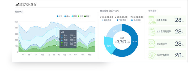 企业经营分析直观呈现,经营状况、费用构成、盈利指标为企业老板提供清晰的分析数据和决策建议。