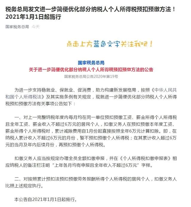 近日,国家税务总局发布关于进一步简便优化部分纳税人个人所得税预扣预缴方法的公告,其中规定,从2021年1月1日起,在纳税人累计收入不超过6万元的月份,暂不预扣预缴个人所得税。