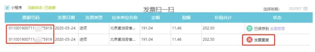 通过微信直接扫描发票的二维码,发票信息可以直接读取到畅捷通好会计,在云端实时保存内容不怕数据丢失,同时智能查验发票真伪。如果是重复报销的发票,会计能在界面看到“发票重复”的提示。