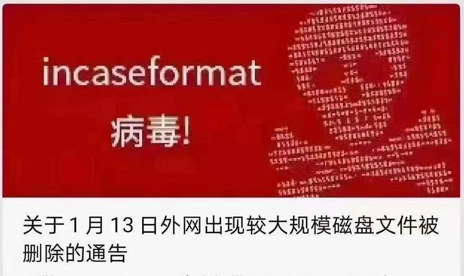 【紧急通知】incaseformat病毒全国爆发,企业数据被格式化!