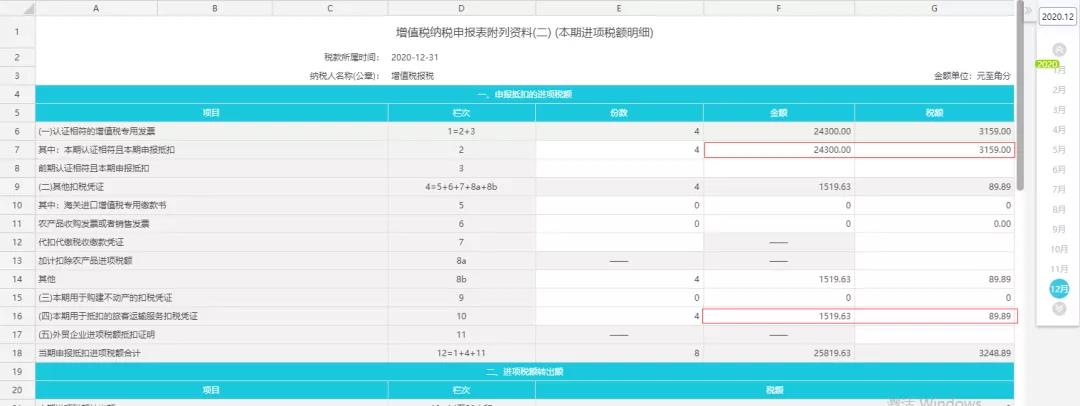 (3)附表二:仅呈现本期的进项情况明细,发票金额(不含税)及进项税额,目前大部分公司的进项是来自于公司从供应商获取的增值税专用发票以及可以进行认证抵扣的运输服务发票,取数也是来自于发票管理模块中已认证的进项发票和运输服务抵扣表中的抵扣明细。