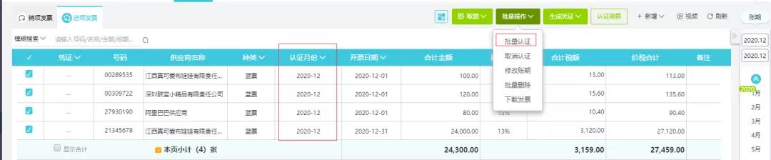 由上图所示,运输服务抵扣表在发票上传后已经自动计算好了进项抵扣额。然后和税局已经进行认证抵扣的进项发票同步,在【发票管理】中,将进项票进行批量认证。