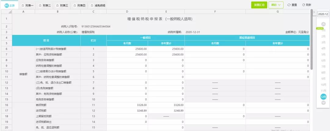 这时我们可以看到,【税务管理】-【增值税申报表】,已经将本期的进项发票金额,销项税额,进项税额上传,自动取数,计算出本期应缴纳的增值税额。
