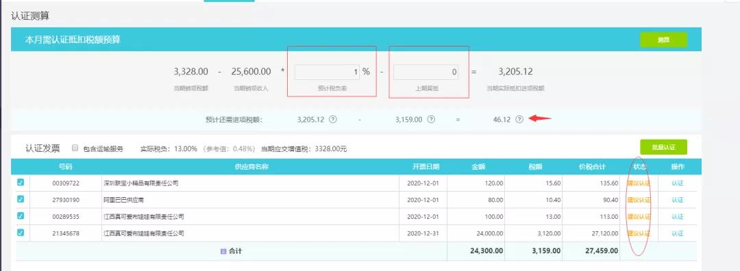 系统测算完理想的进项税额之后,会对本期的进项发票提出是否建议认证。