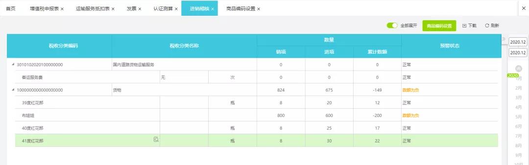 如图所示,系统已经提示出商品“布娃娃”的结存出现赤字,对于商贸行业来说,正常流程是购进货物再销售出去获得利润,进货数量肯定不会低于销售数量,结存赤字一旦发生,税局很可能视同企业虚开发票,增加税务风险,当软件报出预警时,我们需要检查是否有进项票未入账,或者是要做先做暂估。