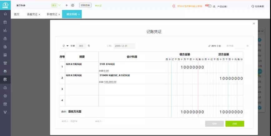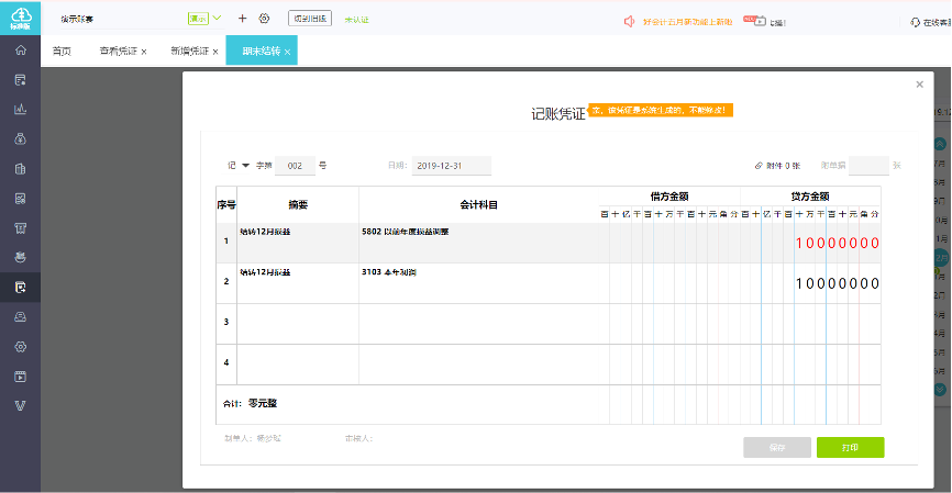 点击期末-期间损益结转,系统自动结转当期损益调整