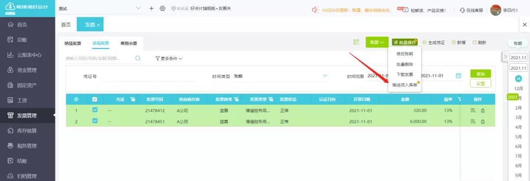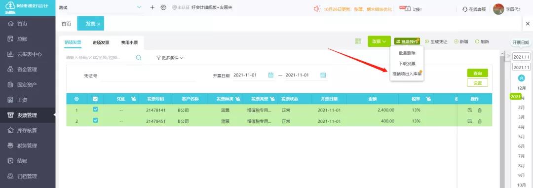 第一步:通过【发票管理】取入销项与进项发票后,勾选发票,点击【批量操作】,销项发票选择【推销项出入库单】,进项发票选择【推进项入库单】;