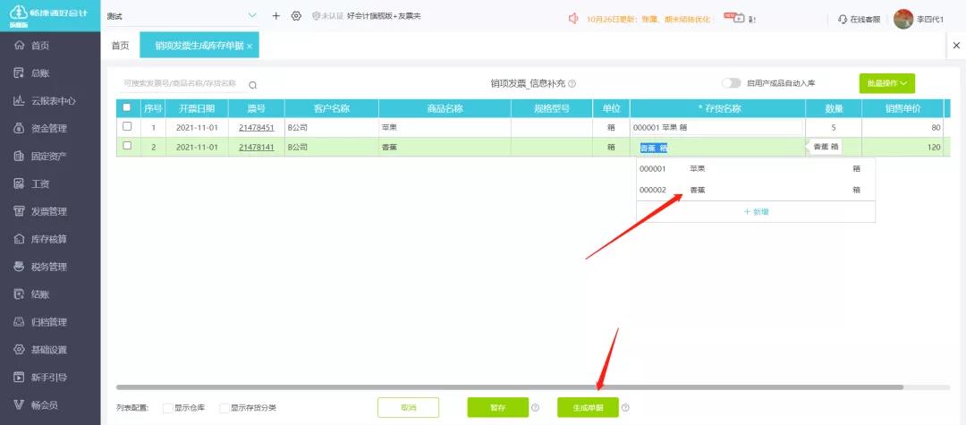 第二步:维护发票的【存货名称】,给每张发票对应上存货,也可点击右上角【批量操作】批量指定,系统拥有记忆功能,后期相同商品会直接匹配存货名称,无需我们再次匹配,完成后点击【生成单据】;