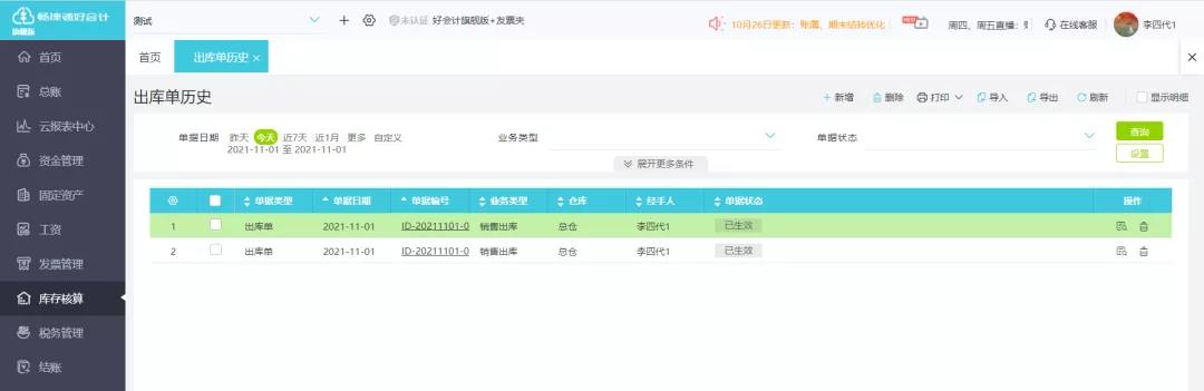 第三步:系统会自动生成商品的出入库单,每张发票后面可以看到单据编号,在【库存核算】-【出库单历史】/【入库单历史】也可以查看单据明细。