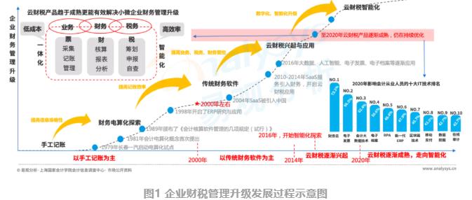 当前,企业财税管理已迈入云财税和财税智能化阶段,小微企业云财税产品趋于成熟和稳定,并且在财务云、电子发票、电子档案、人工智能等技术的影响下仍在持续优化。云财税向一体化(票、财、税一体化)、智能化方向发展,智能云财税、服务一体化成为领先产品的显著特征,例如畅捷通好会计不断提升产品智能化,并将电子档案、银企互联、费用报销等引入产品服务体系,实现票、财、税、费、银、档案一体化应用。