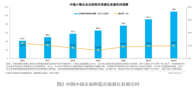随着智慧税务建设、税务大数据共享应用,将进一步倒逼企业,尤其是占据市场主体绝大多数的小微企业财税管理走向规范化、数字化、智能化。云财税以其低成本、高效、高质量的特点成为小微企业财税管理升级最有效工具,因此预计小微企业云财税服务需求将被快速激活。