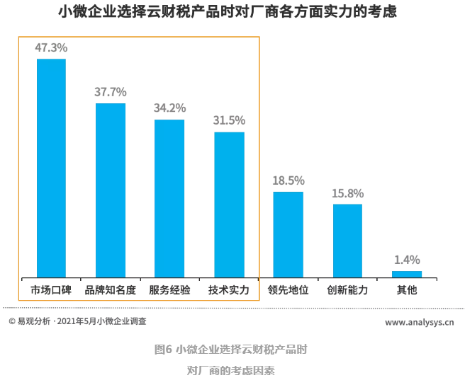 易观分析:十三五期间,中国营商环境持续改善,小微企业发展得到政策持续稳定扶持,预计未来十四五时期,政策红利将维持持续稳定的预期,小微企业的生存和发展条件将持续得到改善,小微企业以财税管理为核心的管理能力优化成为未来市场竞争力提升的关键路径。限于成本、质量等多方面因素的综合考虑,云财税形式成为解决当前小微企业财税管理问题,实现小微企业财税管理规范化、数字化、智能化升级的最有效工具。