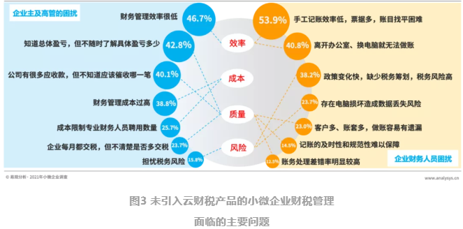 通过对小微企业持续跟踪调研发现,小微企业财税管理普遍面临成本、效率、质量、风险四大问题,当前云财税产品一体化服务的成熟体系能够有效解决小微企业财税管理升级面临的主要问题。同时,云财税产品智能化、数字化的特性能够帮助小微企业适应智慧税务的财税管理需求。
