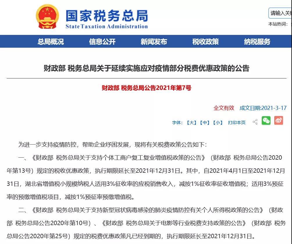 2021年出台的财政部、税务总局公告2021第7号将政策延续到了2021年12月31日。