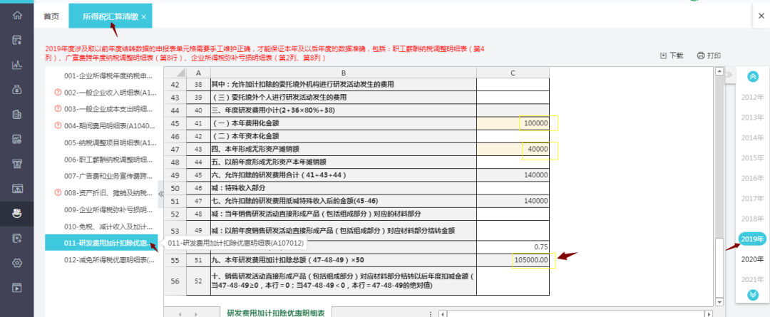 ②备案后,在企业所得税汇算清缴套表中完成申报填写如下: