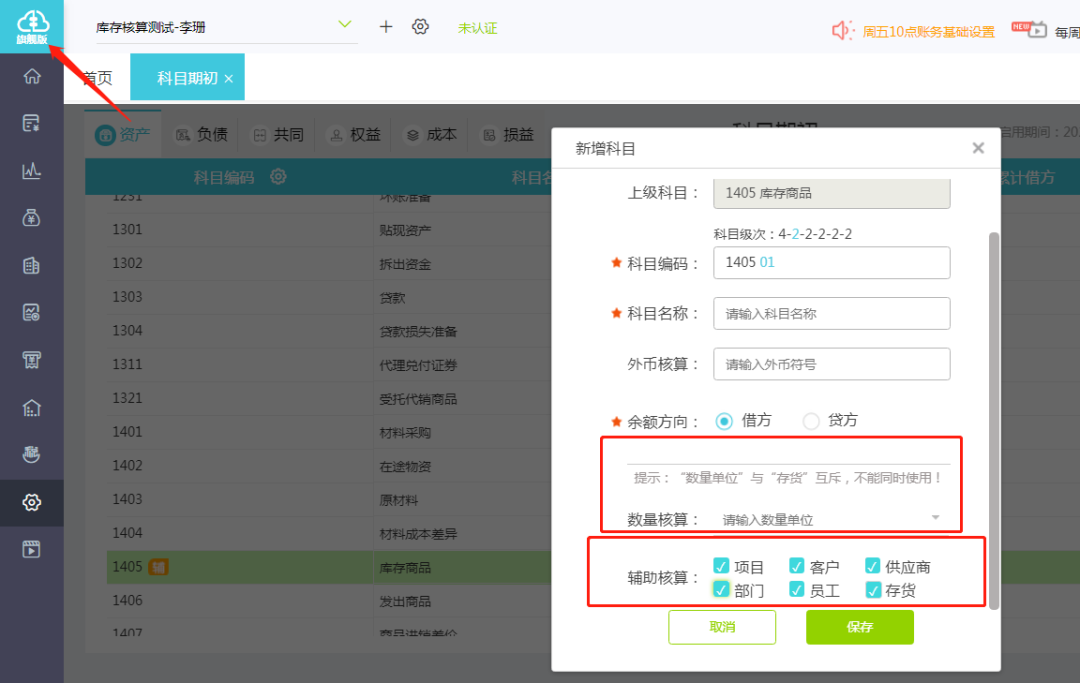 好会计旗舰版支持多辅助核算(可以选择多个辅助核算项目在其后打钩,需注意:数量单位”与“存货”互斥,不能同时使用!)