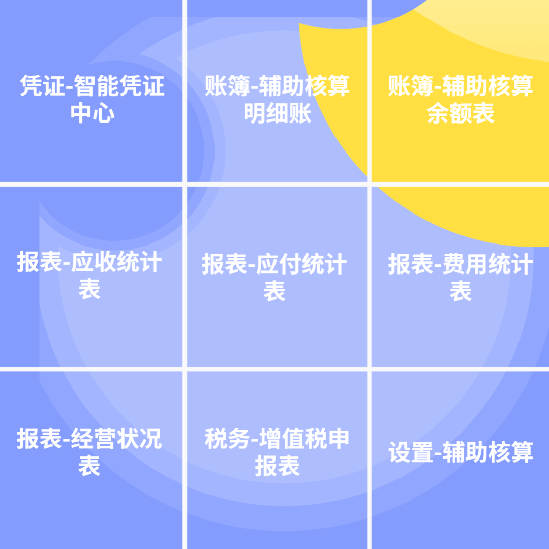 即:凭证-智能凭证中心、账簿-辅助核算明细账、账簿-辅助核算余额表、报表-应收统计表、报表-应付统计表、报表-费用统计表、报表-经营状况表、税务-增值税申报表、设置-辅助核算9个小节点。