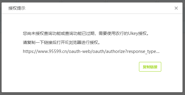 3、如果好会计弹出下面的提示,说明还没有授权。将链接复制到IE浏览器中,插入农行Ukey授权,就可以实时同步数据到好会计软件中了。