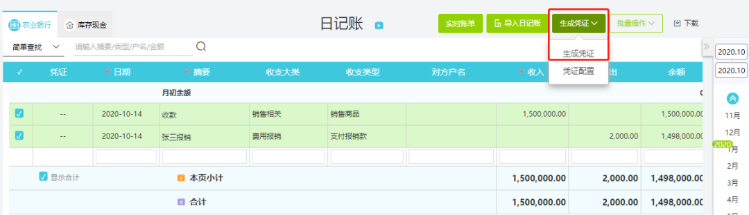 4、银行流水同步到日记账中,可以如下图所示,好会计自动生成凭证。