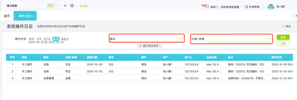 好会计增加【操作日志】节点,可以记录账套内关于凭证、日记账、固定资产、发票等,增、删、改操作。可以通过模块和对应的功能单据筛选对应的操作日志范围
